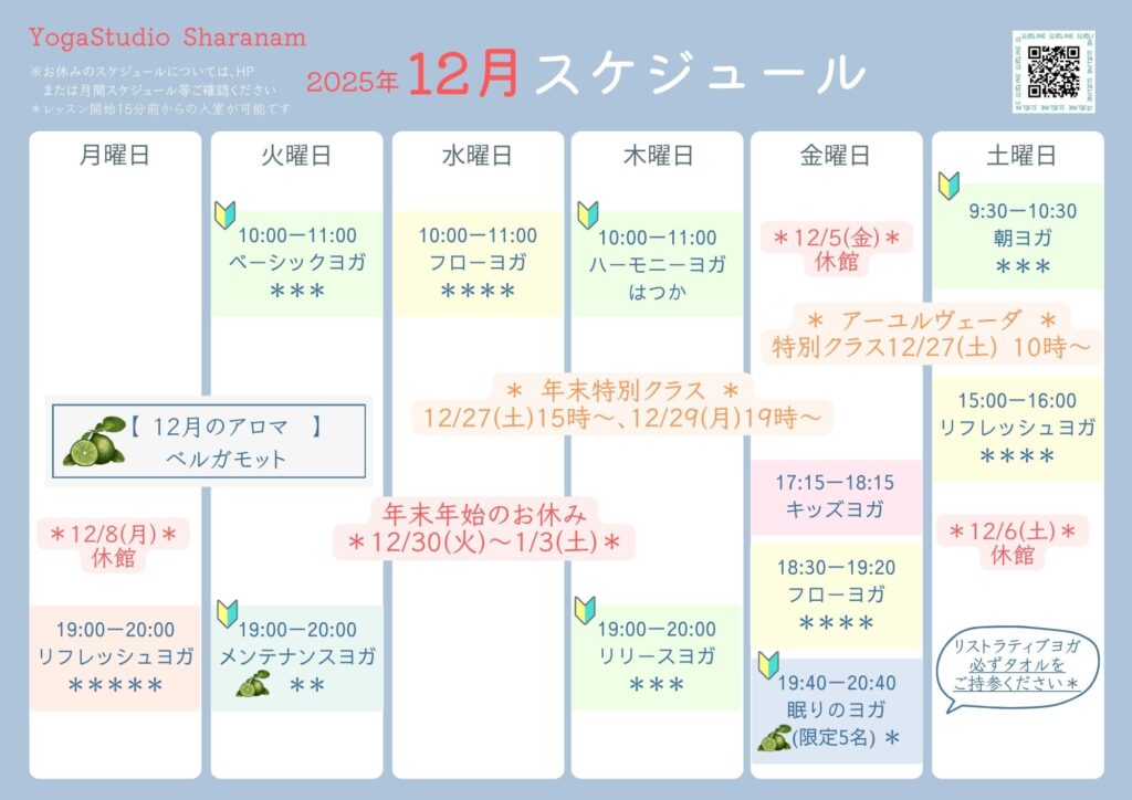 2025年12月スケジュール 2025年12月休講のお知らせ・12/5㊎ 、12/6㊏ 、12/8㊊ 休館、年末年始のお休み 12/29㊊~1/3㊏・12/27㊏朝クラスは特別クラス(アーユルヴェーダ/はつかT)へ変更・12/27㊏、12/29㊊ 年末特別クラス開催! 公式LINE:@oud6367m (LINEで検索をお願いします*) https://lin.ee/GnKTaSz レッスンのご予約はLINEまたはメールお電話で直接ご連絡ください!
